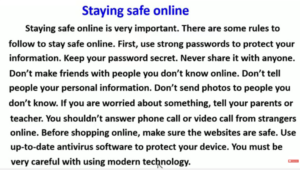 Staying safe online is very important. There are some rules to follow to stay safe online. First, use strong passwords to protect your information. Keep your password secret. Never share it with anyone. Don’t make friends with people you don’t know online. Don’t tell people your personal information. Don’t send photos to people you don’t know.