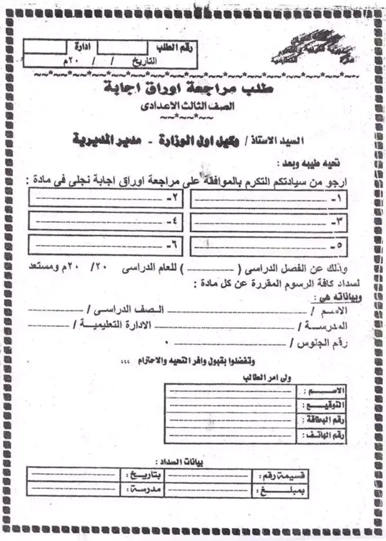 أرجو من سيادتكم التكرم بالموافقة على مراجعة أوراق إجابة نجلي في مادة (المادة) وذلك عن الفصل الدراسي (الفصل الدراسي) للعام الدراسي ۲۰/۲۰م. وأنا مستعد لسداد كافة الرسوم المقررة عن كل مادة.